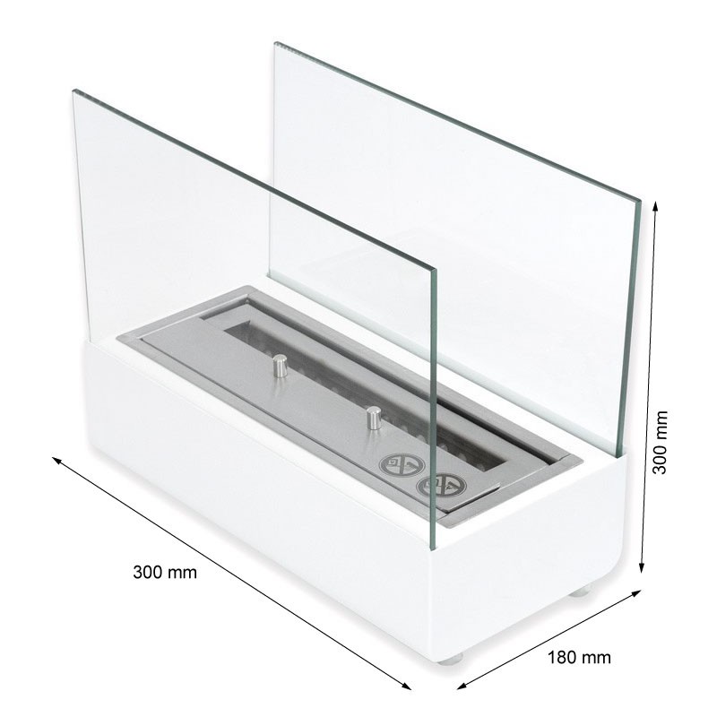 Denne hvite, stilrene og minimalistiske bordbiopeisen er perfekt for å skape ekstra hygge i hjemmet. Med en 1 liters brenner har peisen en brenntid på opptil 5 timer og en varmeeffekt på 1,5 kW. Den kan fritt plasseres på reoler, hyller, bord eller gulv uten behov for tilkobling eller avtrekk. Med sikkerhetsglass på begge sider tilbyr den en trygg og behagelig flamme. Minimum romstørrelse er 30 m³, vekten er 5 kg, og høyden er 30 cm, noe som gjør den ideell for leiligheter og mindre hjem.